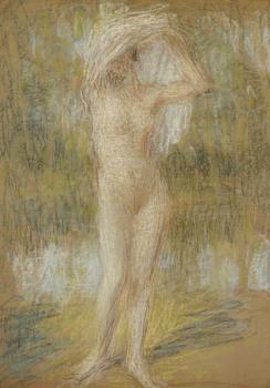 Nu debout, de face, bras lev�s, tenant une draperie