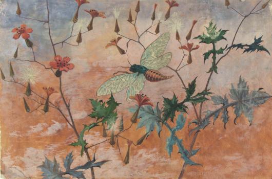 Mod�le de d�cor pour la fa�ence : cigale volant au milieu de prenanthes