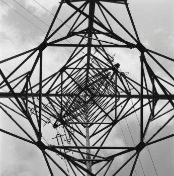 Enchevêtrement régulier d'un pylône vue de bas en haut par-dessous