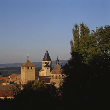 Abbaye de Cluny, clocher de l'Eau bénite et tour de l'Horloge vus du parc