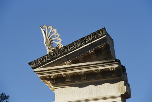 Site archéologique de Glanum, centre monumental, petit temple géminé, détail du fronton