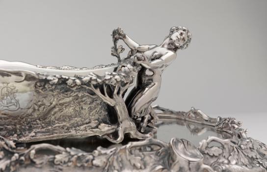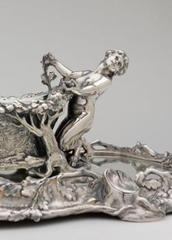 Surtout à fond de glace: La forêt, détail de la jardinière Faunesse et de la partie centrale du plateau à glace