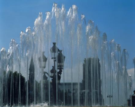 Cathédrale Notre-Dame de Paris à travers les jets d'eau des fontaines du parvis de l'hôtel de ville