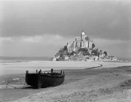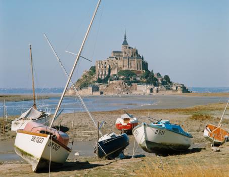 Abbaye du Mont-Saint-Michel et bateaux de pêche sur la grève