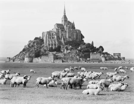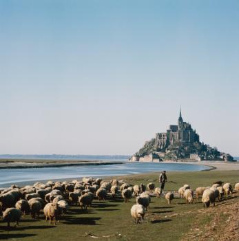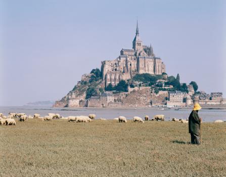 Mont-Saint-Michel et berger gardant ses moutons sur les prés salés