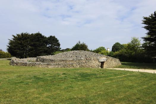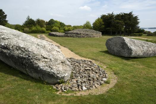 Table des Marchand, chambre polygonale, dalle gravée et appareillage en pierres sèches du cairn