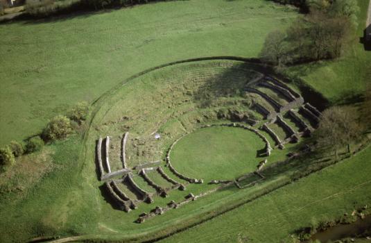 Sanctuaire gallo-romain de Sanxay, vue aérienne du théâtre depuis le nord