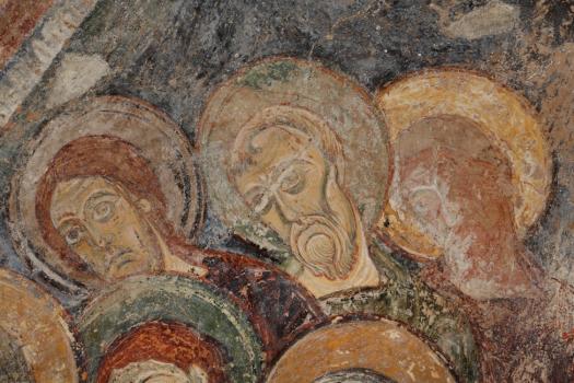 Chapelle des moines de Berzé-la-Ville, détail de la représentation de saint Pierre entouré d'apôtres à la gauche du Christ