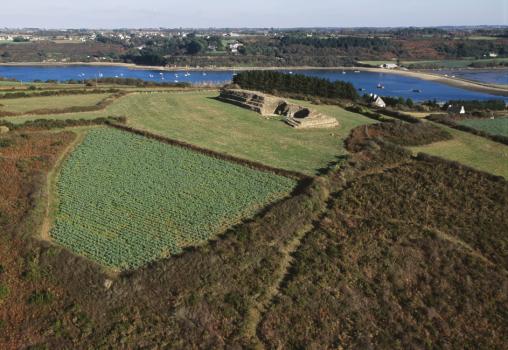 Vue aérienne du cairn de Barnenez et de la baie de Morlaix depuis l'est