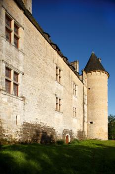 Château d'Aulteribe, façade ouest, entre les deux tours sud, au coucher du soleil