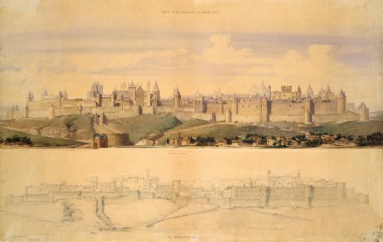 La Cité de Carcassonne. Côté ouest. Élévation restaurée. État actuel des fortifications