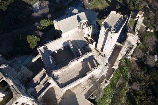 Abbaye de Montmajour, vue aérienne de l'église abbatiale, du cloître et de la tour Pons de l'Orme