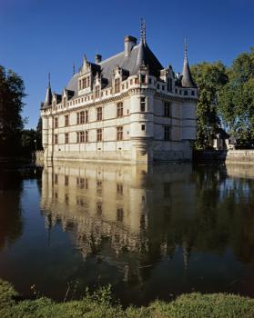 Château de Puyguilhem, vue d'ensemble côté est et labyrinthe de buis