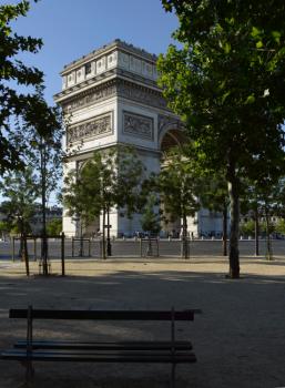 Arc de triomphe de l'Étoile, côté sud-est, vue partielle derrière des arbres de la place