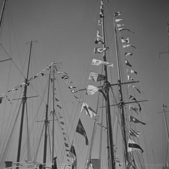 Drapeaux français et européen flottant sous l'Arc de triomphe de l'Étoile