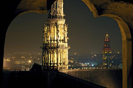 La tour Perret et la flèche de la cathédrale d'Amiens éclairées de nuit