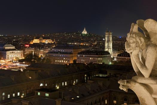 Vue panoramique depuis la galerie des chimères de la cathédrale Notre-Dame de Paris, la stryge, le Châtelet, l'église saint-Eustache, la tour saint-Jacques et le Sacré-Coeur
