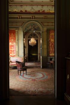 Château de Bouges, enfilade de la salle à manger, de la salle de jeux et du grand salon vue depuis la salle à manger