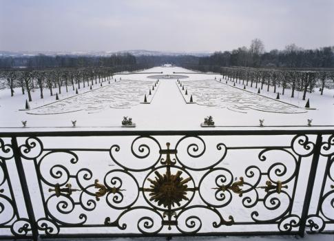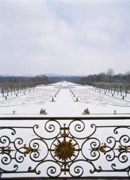 Château de Champs-sur-Marne, perspective du jardin sous la neige depuis le balcon du salon de musique