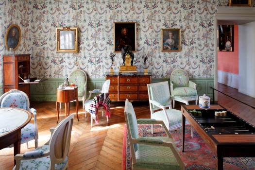 Château de Carrouges, le salon des portraits jouxtant le salon d'été occupant l'aile sud-est, cheminée de granit à décor polychrome