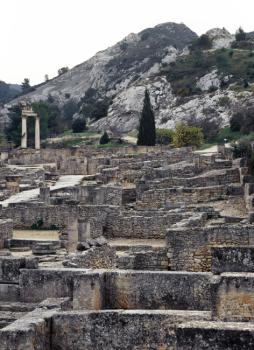 Site archéologique de Glanum, vue en direction de la maison de Cybèle et d'Atys et du petit temple géminé