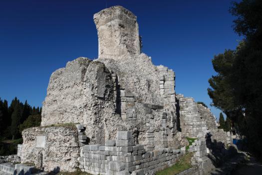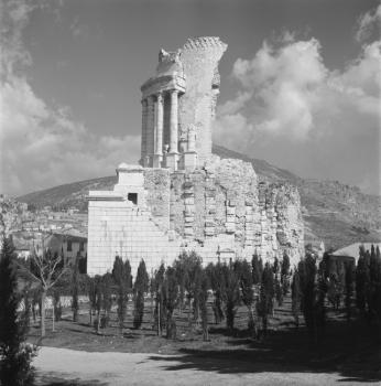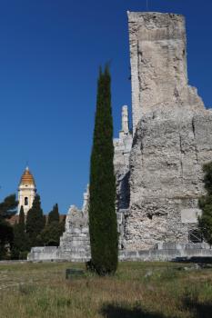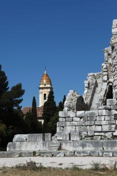 Trophée d'Auguste, face est; à l'arrière-plan, église Saint-Michel