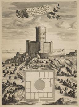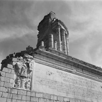 Trophée d'Auguste, soubassement de la face est (détail); à l'arrière-plan, église Saint-Michel