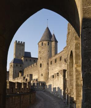 Cité de Carcassonne, front ouest de l'enceinte intérieure, tour de l'Inquisition, tour de la Justice et porte d'Aude