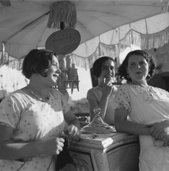 Femme, homme et deux jeunes filles s'abritant sous des ombrelles