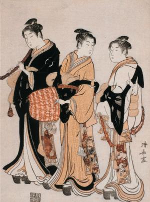 Trois jeunes femmes déguisées en Komuso (ménestrel ambulant)