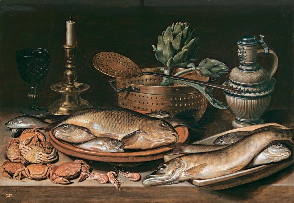 Bodegón con pescado, alcachofas