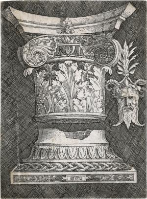 Base et chapiteau de colonne avec un ornement en forme de masque