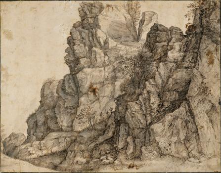Massif rocheux avec un dessinateur au premier plan