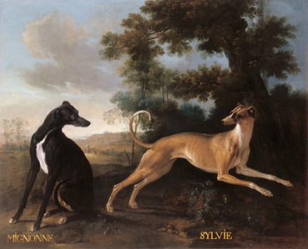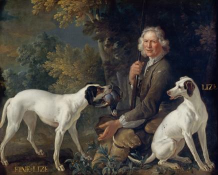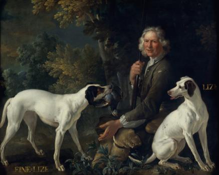 Portrait du garde-chasse La Forêt et de Fine-Lise et Lise, deux chiennes de la meute royale