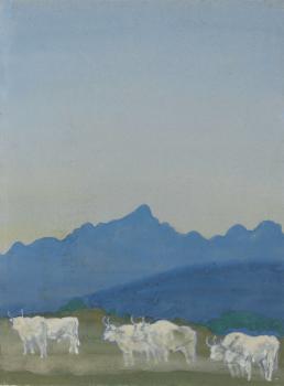 Three pairs of white bulls on a mountain landscape
