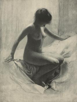 Naked woman sitting three-quarters back, on a chair, face in profile left