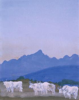 Three pairs of white cattle on a mountain backdrop (the Apennines) in the morning