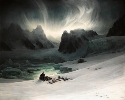 Magdalena-Bay, vue prise de la presqu'île des tombeaux, au nord du Spitzberg. Effet d'aurore boréale
