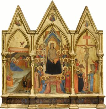 Tryptique fixe. Au centre : La Vierge et l'Enfant entourés de vingt anges et de quatre saints (Jean-Baptiste, Pierre, Paul et Laurent [?]), à gauche : La Nativité, à droite : La Crucifixion