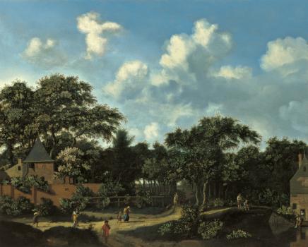Vista del río Vecht, con un embarcadero, pescadores y el Castillo de Nijenrode en la lejanía