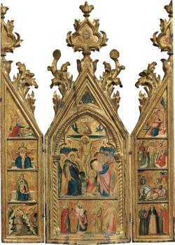 Tríptico portátil: La Crucifixión (tabla central), El Arcángel Gabriel y otras escenas (tabla interior izquierda),La Virgen de la Anunciación y otras escenas (tabla interior derecha)